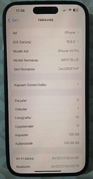 🚨 TƏCİLİ! 📱 iPhone 14 Pro | Deep Purple | 128 GB 🔋 Batareya 84% ✅ Face ID və True Tone tam işləkdir 🔧 Zavod vəziyyətindədir, açılmayıb, təmir olunmayıb 👤 Birinci və yeganə sahibiyəm 💯 Çox səliqəli...