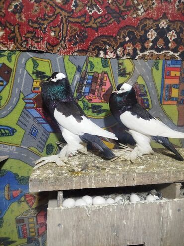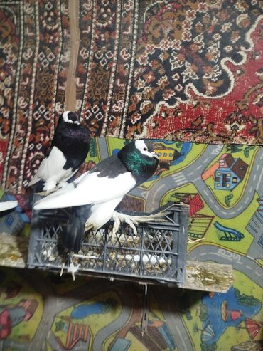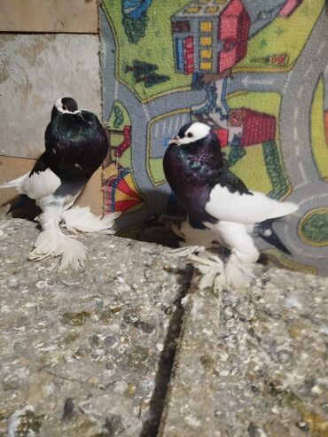 Məhsul: Bəzək üçün fiqurlu göyərçinlər - Növ: Quyruğu geniş, yelpik formalı bəzək göyərçinləri (fantail tipli). - Rənglər: - Qara-ağ qarışıq (boz-qara fon üzərində ağ ləkəli, boyunda yüngül ya...