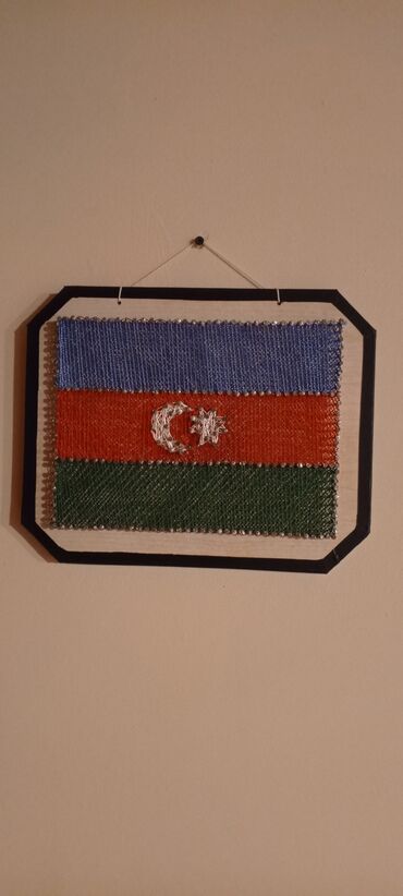 Azərbaycan bayrağının rənglərini və ay-ulduz simvolunu əks etdirən ip sənəti əsəri. Mavi, qırmızı və yaşıl rəngli iplərlə işlənmiş bu dekorativ tablo, taxta əsas üzərində dırnaqlar vasitəsilə yarad...