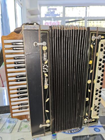 Akkordeon – klavişli və bas düyməli - Tip: Klavişli akkordeon (piano klaviaturası) və sağ tərəfdə bas/akord düymələri - Korpus: Qəhvəyi-mərmər fakturalı örtük, metal yan qapaqlar, klassik keçə kör...