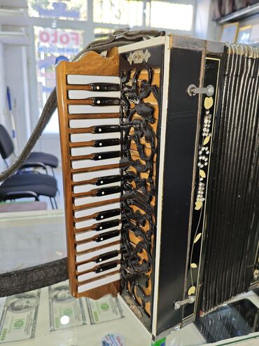 Məhsul: Qarmon/akkordeon (klavişli) Qiymət: 7000 AZN Xüsusiyyətlər: - Korpus: Qara rəngli, naxışlı və bəzək elementləri ilə (qızılı not işarələri, lövhəciklər, çiçək ornamentləri) - Klaviatura: Sa...
