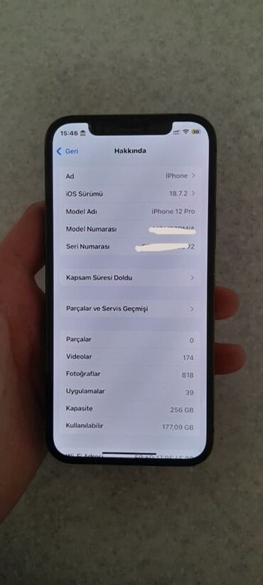 Apple iPhone 12 Pro Max – 128 GB - Model: iPhone 12 Pro Max (Model nömrəsi: MGCF3LL/A) - Rəng: Qrafit/Boz ton - Yaddaş: 128 GB (Kullanılabilir: təqr. 111.83 GB ekranda görünür) - iOS versiyası: 16...