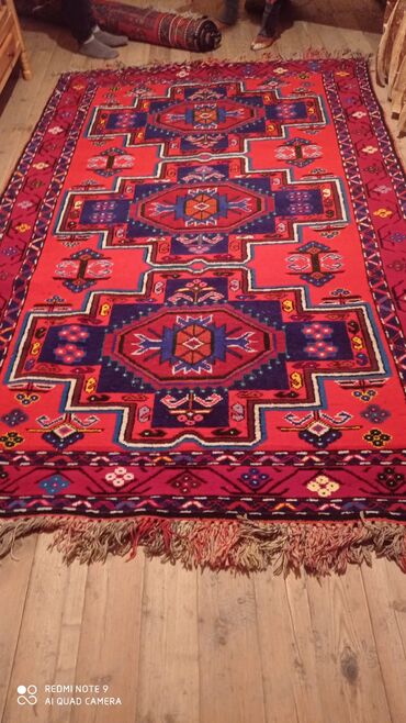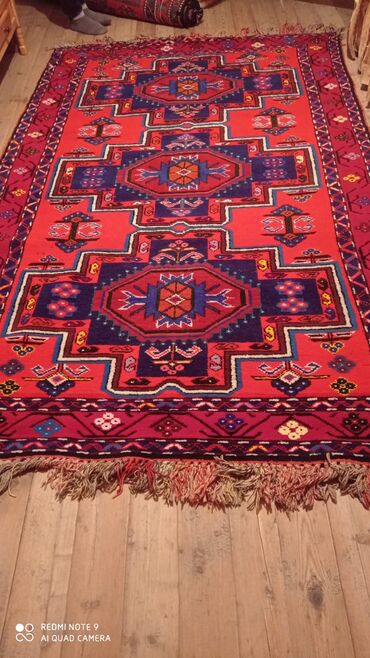 Xalça – əl toxuması, Şərq üslubunda klassik geometrik naxışlı. - Rəng palitrası: tünd lacivərt, qırmızı, qəhvəyi, göy, sarı və krem tonları. - Mərkəzdə üç böyük medalyon kompozisiyası, aralarında ...