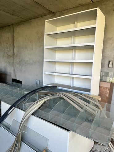 - Böyük ağ rəngli vitrinalı rəf: çoxqatlı, geniş bölmələr, arxa dayaqlı konstruksiya. Mağaza və anbar üçün uyğun saxlama-sərgiləmə həlli.
