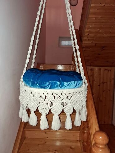 Makrame üslubunda asma yelləncək/kreslo.150kq ceki goturur - Material: qalın toxunmuş ipdən makrame texnikası ilə hazırlanmış korpus, alt hissədə dekorativ toxuma və iri püsküllər. - Asqı sistemi:...