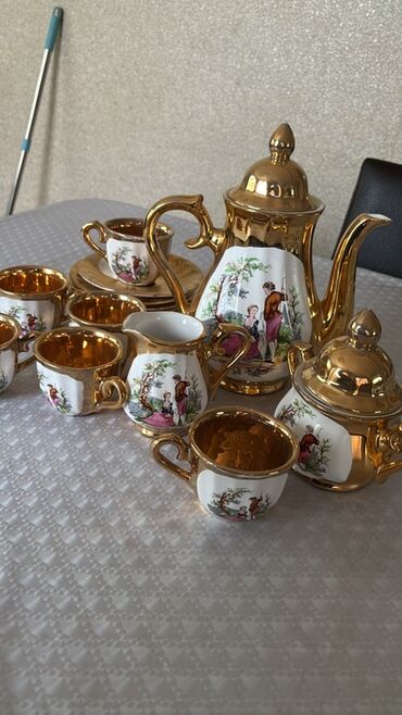 - Qızılı naxışlı çay–qəhvə dəsti: porselendan hazırlanmış, klassik romantik süjetli dekorlu. Dəstə qızılı detallı qəhvə/çaydan, süd qabı, şəkərqabı, boşqabla birlikdə fincan və nimçələr daxildir. Fincanların içi qızılı örtüklüdür.