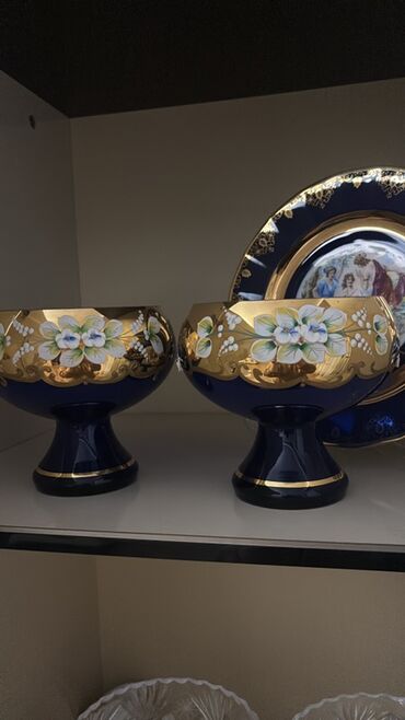 - Kobalt-mavi və qızılı bəzəkli 2 ədəd şirniyyat vazası və dekorativ boşqab: qalın şüşə/gil material, əl işi çiçək motivləri və qızılı haşiyə. Şirniyyat, meyvə təqdimatı və vitrin dekoru üçün idealdır.