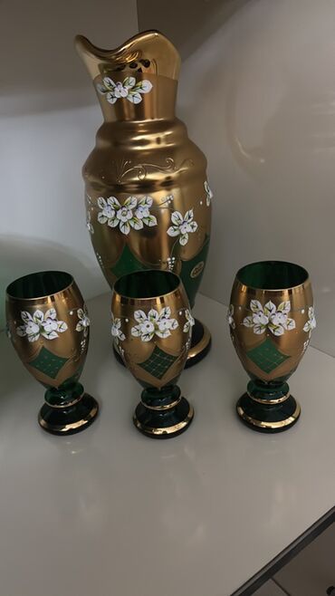 - Büllur/boyalı şüşə sürahi və 3 ədəd qədəh: tünd yaşıl və qızılı tonlarda, əl işi çiçək rəsmləri ilə bəzədilib. Masaüstü servis və dekor üçün uyğundur.