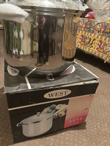 - WEST paslanmayan polad qazanda: qapaqlı iri həcmli bişirmə qazanı. Qutu üzərində göstərilən funksiyalar: qaz və elektrik ocaqlara uyğunluq, asan təmizlənmə, istiliyi bərabər paylama. Gündəlik yemək bişirmə üçün münasibdir.