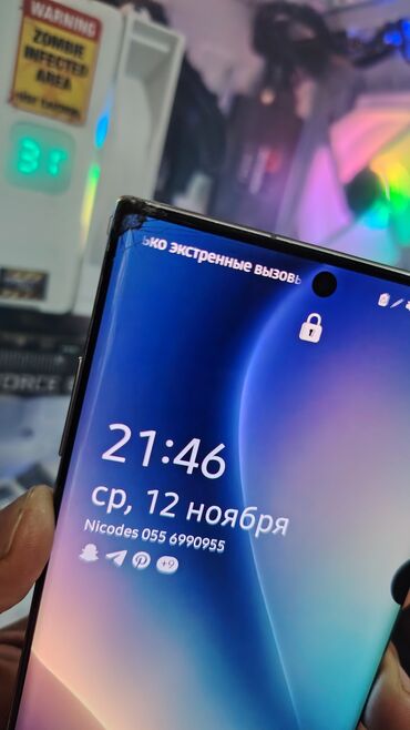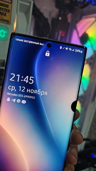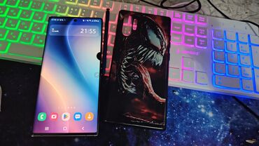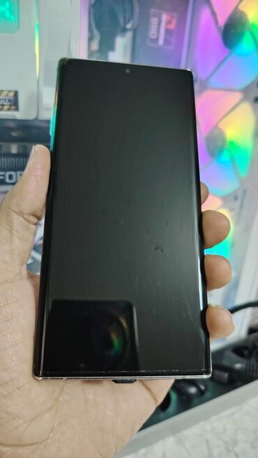 Şəkillərdə cihazın ön və arxa tərəfi, işlək S Pen funksiyası (“Note 10+” yazısı) və tematik örtük göstərilib.