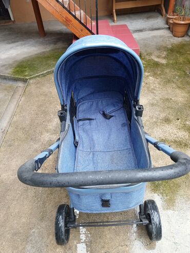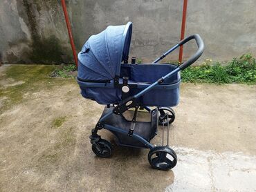 Uşaq arabası – mavi rəng, dərin beşik tipli oturacaq və iri tənzimlənən tentlə.