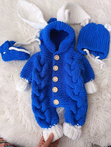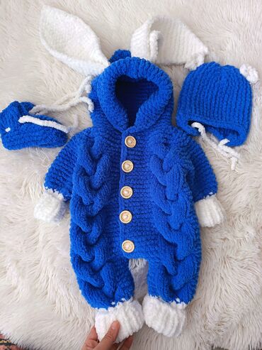 - Komplekt: kapüşonlu kombinezon + 2 papaq (uzun “dovşan qulaqlı” bağlamalı papaq və qulaqcıqlı papaq)