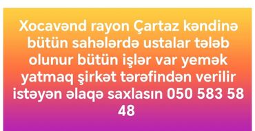 Salam iş xocevendde qalmaga yer var yemek verilir 9 5 e is hefdede 1 defe isdirahet yalniz vaccab da yazn xaiş olunur real işlemek isdeyen adam elaqe saxlasn 10 nefer lazimdi VACCAB YAZN