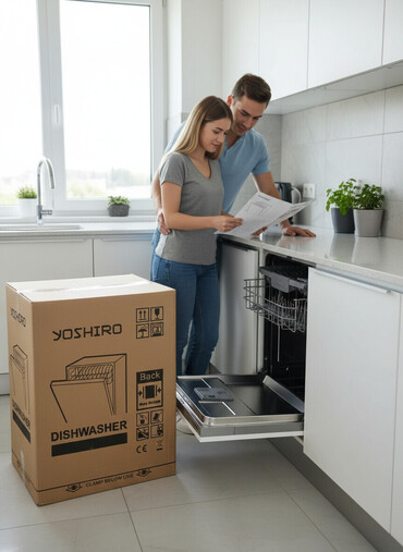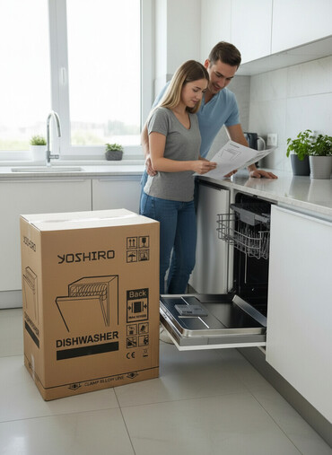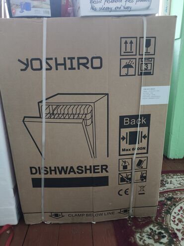 Mətbəx üçün standart qabyuyan dizaynı təsvir olunur; qutuda üst səbət/raf illüstrasiyası var. Qapalı qablaşdırmada, daşınma üçün kəmərlərlə bərkidilmişdir.