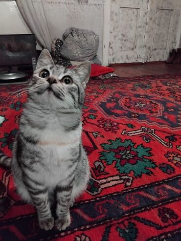 Ev pişiyi – boz zolaqlı tüklü tecili satılır - Növ: Ev pişiyi (qısatüklü), boz-gümüş zolaqlı rəng - Xüsusiyyətlər: yumşaq tüklər, iri badam formalı gözlər, uzun ağ bığlar - Xarakter: sakit və mehr...