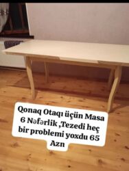 Şəkildə qeyd: “Qonaq Otağı üçün Masa, 6 nəfərlik, təzədi heç bir problemi yoxdu, 65 AZN.”