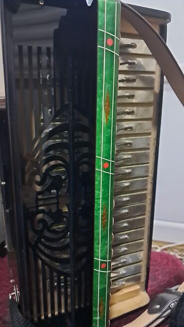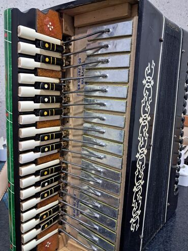 Akkordeon – klavişli və bas düyməli - Tip: Klavişli akkordeon (piano klaviaturası) və sağ tərəfdə bas/akord düymələri - Korpus: Qəhvəyi-mərmər fakturalı örtük, metal yan qapaqlar, klassik keçə kör...