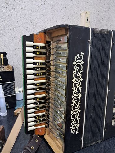 Məhsul: Klaviaturalı akkordeon Təsvir: - Korpus: qara rəngdə, dekorativ naxışlı panellər - Klaviatura: sağ tərəfdə pianino tipli 25 düymə/klaviş sırası - Bas/akkompaniment: sol tərəfdə sıra ilə dü...