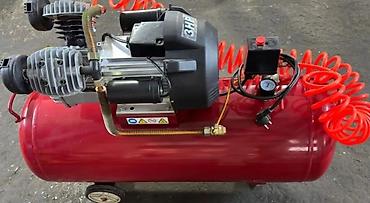 - Hava kompressoru: Elektriklə işləyən, qəbuledici (rezervuar) çəni, manometr və təzyiq releli idarəetmə bloku, tez qoşulma üçün spiral hava şlanqı və fiş. Emalatxanada təkər aparatının və hava alətlərinin qidalanmasına uyğundur.