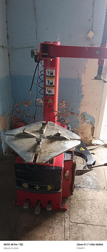 - Təkər-söküb-taxma aparatı: Sürüşməyən sıxma “çənələri” olan fırlanan masa, üç pedallı idarəetmə (sıxma/fırlatma/bonnet açma), şin qoparıcı qolu, hava xətti çıxışı. Radial və aşağı profilli şinlərlə işləməyə imkan verir.
