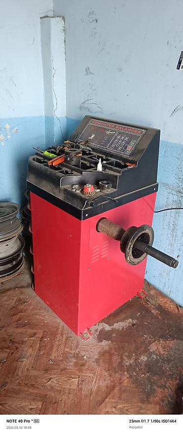 - Kompüterlə idarə olunan təkər balans qurğusu (Computer Balancer): Rəqəmsal panel, proqram düymələri, ölçü göstəriciləri və konus adapterləri ilə. Təkərin oxa bərkidilməsi üçün vintli mil və sıxma flanşı mövcuddur. Yük avtomobili və minik təkərləri üçün uyğun müxtəlif ölçü konusları üst hissədə saxlanılır.