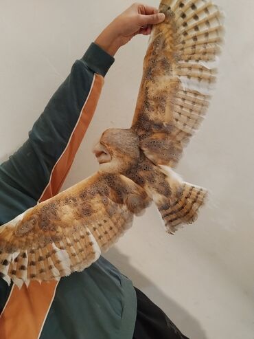 Bərəkət bayquşu (Tyto alba) taksidermiya nümunəsi – tam açılmış qanadları ilə dekorativ eksponat. Xüsusiyyətlər: - Növ: Bərəkət bayquşu (Tyto alba) - Təbii rəng palitrası: qızılı-qəhvəyi, krem və ...