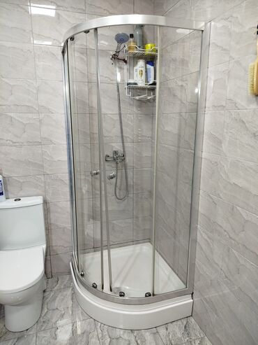 Şüşə duş kabinası - Forma: L formalı, iki tərəfi şüşədən, künc yerləşdirmə üçün. - Qapı sistemi: Sürgülü qapılar; hər iki tərəfdə paslanmayan metal tutacaqlar. - Material: Yarı mat (frosted) və şə...