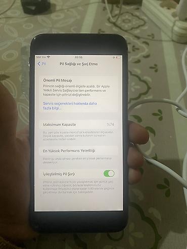 - Batareya: Ayarlar > Pil bölümündə maksimum tutum 74% göstərilir; “İyileştirilmiş Pil Şarjı” aktivdir. Ekranda “pil sağlığı azalıb” mesajı görünür.