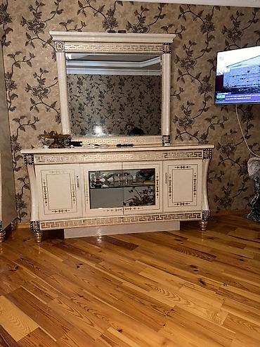 - Konsol/bufet: 2 yan şkaf qapısı, ortada şüşəli bölmə və rəflər. Üstündə iri güzgü çərçivəsi ilə birlikdə.