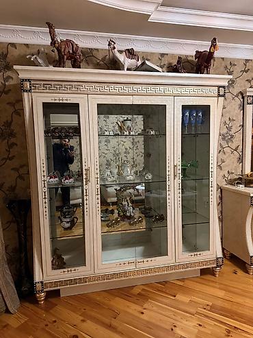 - Böyük vitrin şkaf: 3 qapılı, ön hissəsi şüşə, içəridə şüşə rəflər və güzgülü arxa fon. Ekspozisiya üçün işıqlanma quraşdırmağa uyğun.