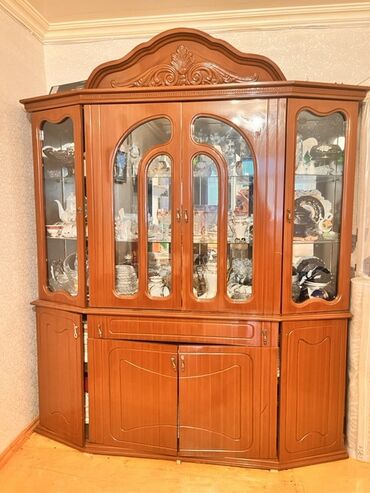 Təcili satılır 50 manata. Klassik dizaynlı böyük vitrin-şkaf - Material: taxta (cilalanmış təbii ağac teksturalı) - Rəng: isti qəhvəyi, laklı səth - Ön hissə: mərkəzdə şüşə vitrin bölməsi (çərçiv...