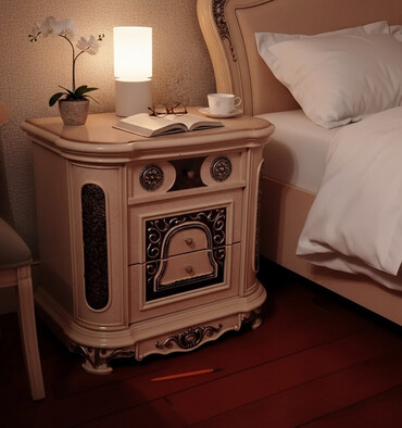 • Komodin – üstündə dekorativ işçilik, mərkəzdə ornamentli panel, iki çekmece və əlavə yuxarı bölmə.