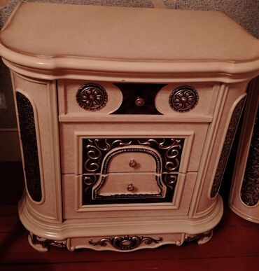 Klassik üslubda yataq otağı və qonaq mebel dəsti ve kuxna stol desti Yataq otağı: - 2 nəfərlik çarpayı, krem rəngli korpus, yumşaq şabalıdı-bənövşəyi başlıq; başlıq hissəsində dekorativ naxış elem...