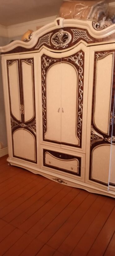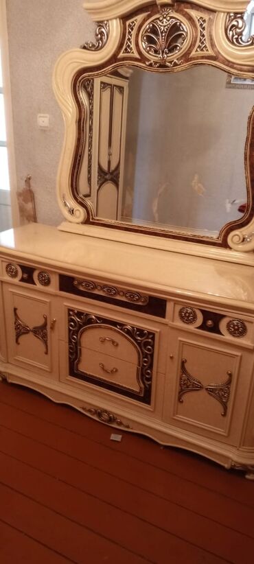 Yataq otağı dəsti - Dördqapılı qarderob: krem rəngli fasad, qara ornamental naxışlar, ortada iri dekorativ güzgü (iki qapıda), bükümlü metal tutacaqlar, dayanıqlı ayaqlar. - Çarpayı: yumşaq krem r...Giriş•Qeydiyyat