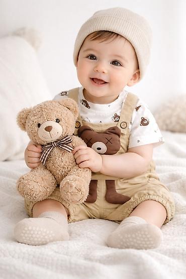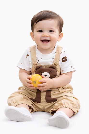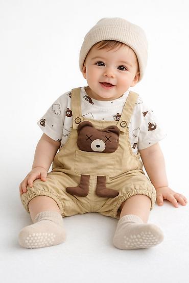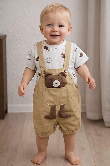 - Qum rəngli şalvar-kombinezon, ön hissədə 3D ayıcık aplikasiyası və düyməli askılar