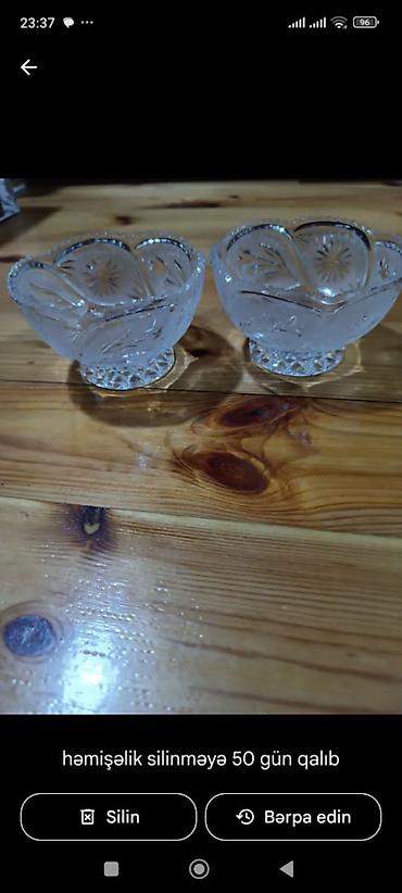 - Şüşə salat/qatıq kasaları: Şüşədən hazırlanmış, kabartma ornamentli. Şaquli yığıla bilən formadadır, masada desert, salat və ya qəlyanaltılar üçün uyğundur.