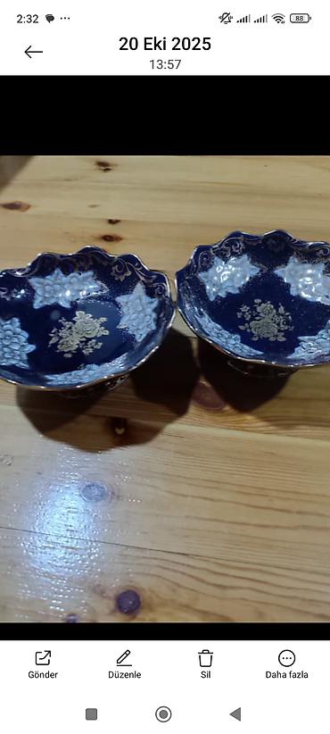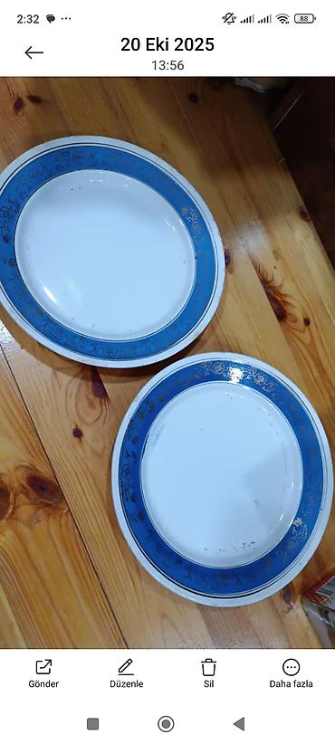 - Böyük boşqablar: 2 ədəd, ağ mərkəzli, kobalt-mavi haşiyədə qızılı naxışlar. Gündəlik istifadədən ziyafət süfrəsinə qədər uyğundur.