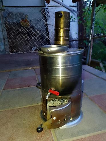 Odun/Kömürlə işləyən samovar tipli su qızdırıcısı (soba üstü qazan) - Yanacaq: bərk yanacaq (odun, kömür) - Quruluş: alt hissədə yanan soba, üstündə silindrik su çəni - Tüstü çıxışı: metal baca bo...