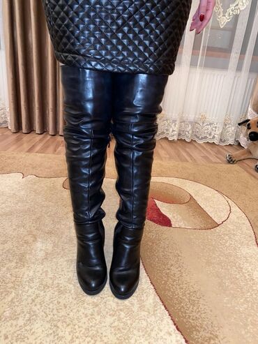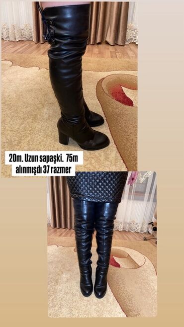 Qadın uzun temiz dəri çəkmə baha alınıb - Rəng: tünd qəhvəyi - Material: yumşaq dəridən, dekorativ iri tikişlər - Dizayn: dizə yaxın hündürlük, yan tərəfdə metal tokalı dekorativ kəmər - Daban: qa...
