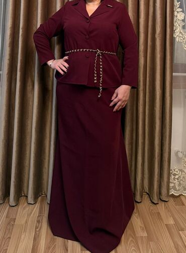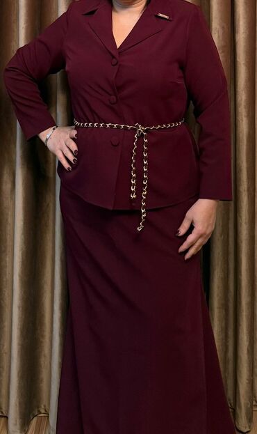 Qadın dəsti – göy rəngdə elegant iki hissə - Üst: uzunqol, asimmetrik kəsimli, yüksək yaxalı. Yan hissədə gizli fermuar; bel üçün ayrıca məxməri kəmər. - Şalvar: düz kəsim, yüksək belli, rahat elas...