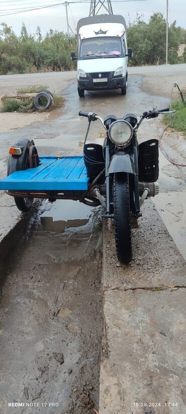 Sovet istehsalı klassik yan qoşqulu motosiklet Xüsusiyyətlər: - 3 təkərli konstruksiya: motosiklet + yan qoşqu - Rəng: mavi - Çexol/sükan: klassik düz sükan, mexaniki göstəricilər - Ön və arxa pal...