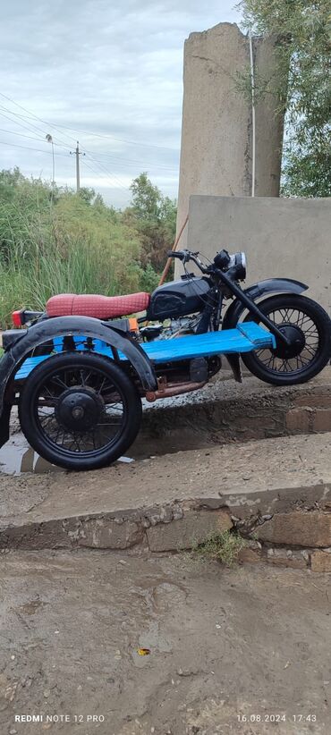 Motosiklet – klassik iki təkərli sovet modeli - Rəng: qırmızı/qara - Mühərrik: 2T, tək silindrli, hava ilə soyudulan - Karbüratorlu, ayaqla işə salma (kick-starter) - Sürətlər qutusu: mexaniki, ay...