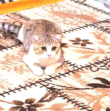 Yaxşı əllərəSevimli pişik – qısa tüklü, üçrəng (boz, krem və ağ) naxışlı kürk, iri ifadəli qəhvəyi gözlər, ağ pəncələr və quyruğunda tünd zolaqlar. Qulaqlar yüngül qatlanmış formadadır. Sakit və mehriban görünüşlü, ev şəraitinə uyğun. İçəri mühitə tez uyğunlaşan, oyun oynamağı sevən ev pişiyi axtaranlar üçün ideal. Foto ev şəraitində çəkilib, pişik xalça üzərindədir. pişiy kstlanıb,peyvəndi vurulub istəyən olsa əlaqə saxlasın CİDDİ ALICILAR ZƏNG ETSİN.