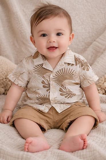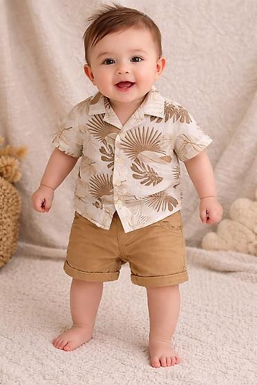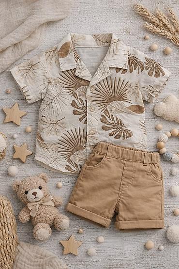 • Köynək: krem rəng üzərində bej/qaramel tropik yarpaq naxışları, yumşaq yaxalıqlı, düyməli, nəfəsalan parça