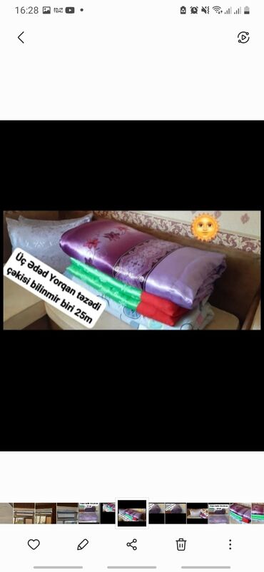 - Yorğanlar: 3 ədəd, atlas/parlaq üzlüklə. Üzərində yazı: “Üç ədəd yorğan təzədi, çəkisi bilinmir, biri 25 m”.