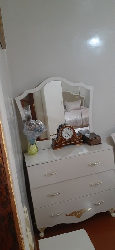 - Komod: 4 çekmecəli, üstündə üçlü güzgü paneli. Ağ rəng, qızılı detal və fiqurlu ayaqlar.