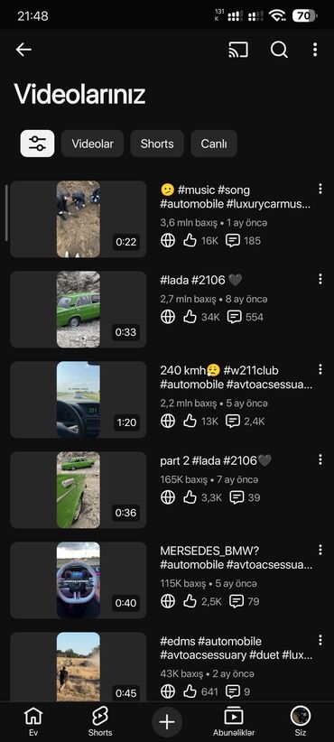 - Shorts formatında yüksək baxışlı kliplər: bir çox video milyonlarla baxış toplayıb (məsələn, 3,6 mln, 2,7 mln, 2,2 mln və s.)