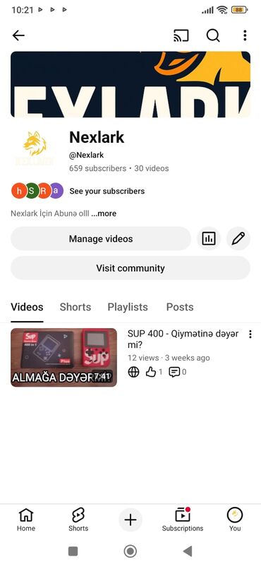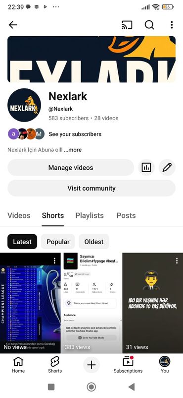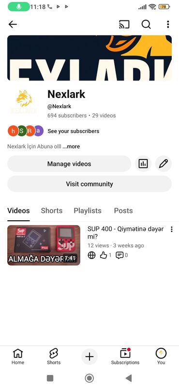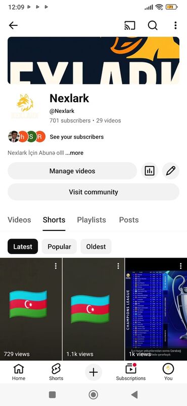 - Kanal bölmələri: Videos, Shorts, Playlists, Posts; Community səhifəsinə keçid mövcuddur.