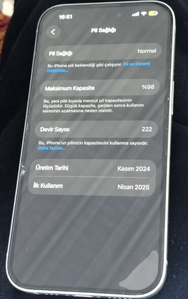- Batareya məlumatı (şəkildən): Maksimum tutum 98%, dövr sayı 222; İstehsal tarixi: Kasım 2024; İlk istifadə: Nisan 2025