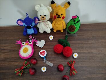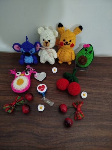 - Amigurumi oyuncaqlar: mavi Stitch fiquru, ağ ayıcık, sarı Pikachu, yaşıl avokado (üz detalı və çiçək bəzəyi ilə). Yumşaq ipdən toxunub, doldurulmuş, özünü dik saxlayan fiqurlar.